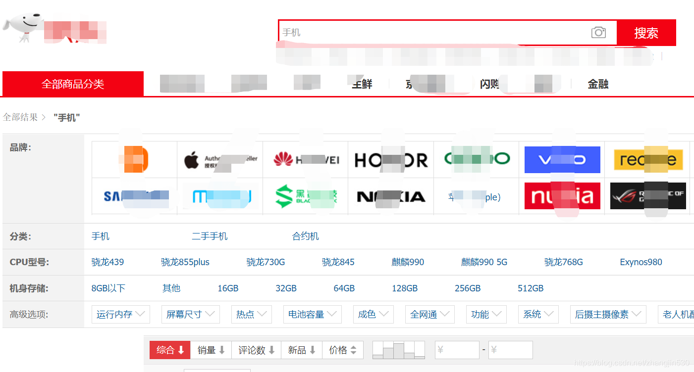 在京东首页上,输入关键词“手机”进行搜索: