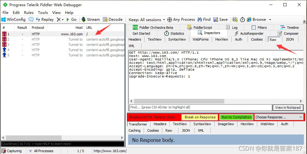 4、被拦截的HTTP请求会显示一个红色的T图标。要修改该请求,首先选中它,然后打开Inspectors面板,在Raw选项卡下进行修改(请注意必须在Raw选项卡下才能进行修改)。