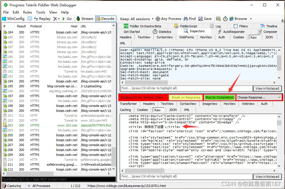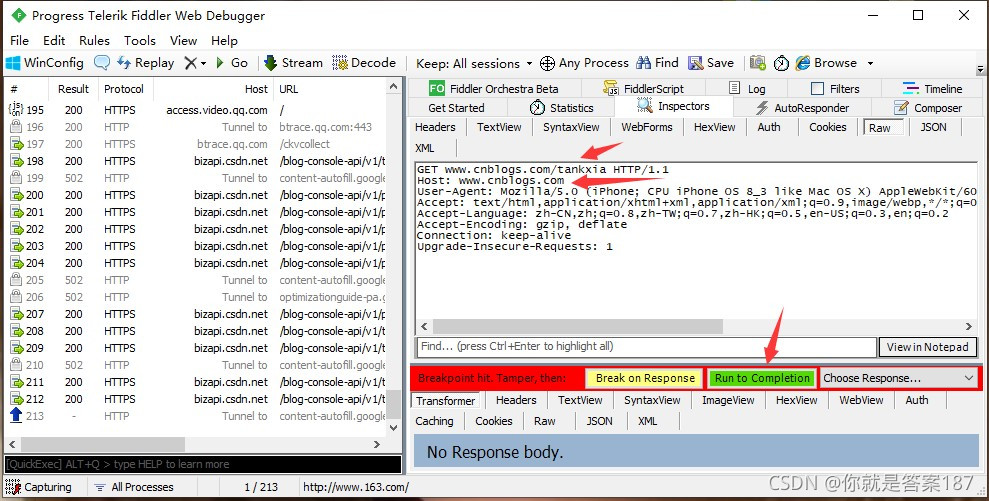 5、把URL 修改为 www.cnblogs.com/tankxia ,同时把Host 修改为 www.cnblogs.com ,然后单击绿色的 Run to Completion 按钮放行。