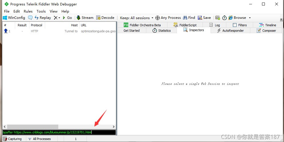 1、打开Fiddler,然后在左下角的QuickExec命令行中输入以下命令:bpafter https://www.cnblogs.com/bluesummer/p/15219701.html。