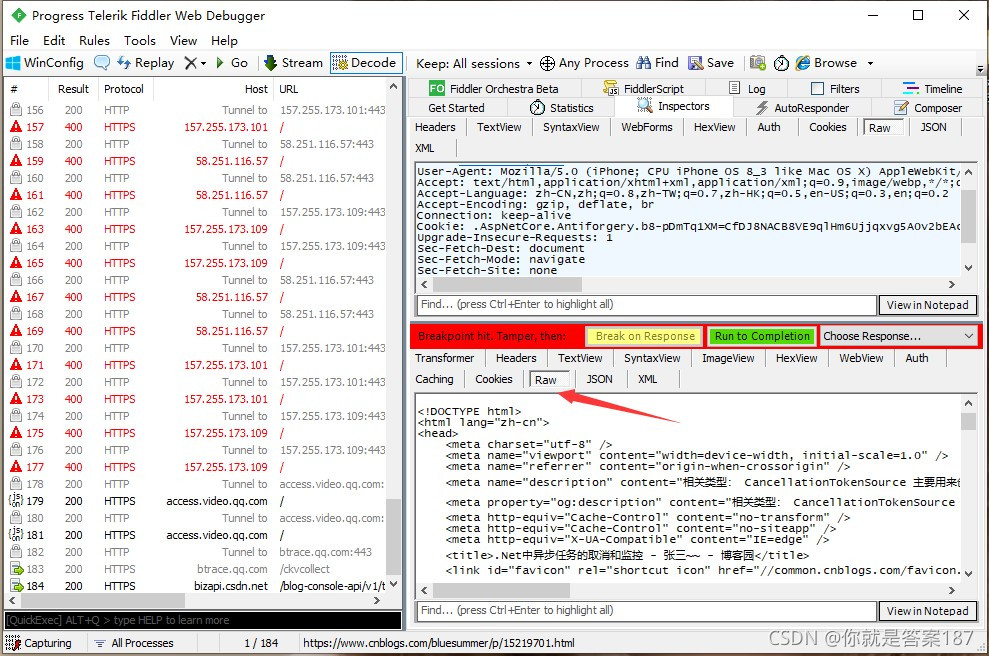2、打开浏览器,输入https://www.cnblogs.com/bluesummer/p/15219701.html,在Fiddler 4中选中https://www.cnblogs.com/bluesummer/p/15219701.html,选择Inspectors面板,进入Response,在Raw选项卡下进行修改(请注意必须在Raw选项卡下进行修改)。