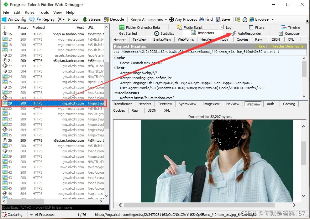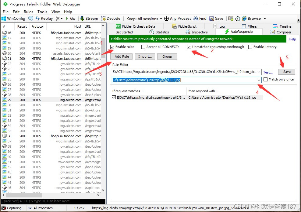在Fiddler 4中,找到包含该图片的Session,并将其拖拽到AutoResponder中。